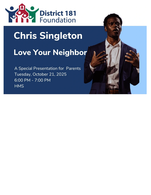 Inspirational Speaker Chris Singleton will be presenting to all CHMS and HMS students during school. He has offered to share his presentation with parents in the evening. All interested District 181 parents are invited to attend.